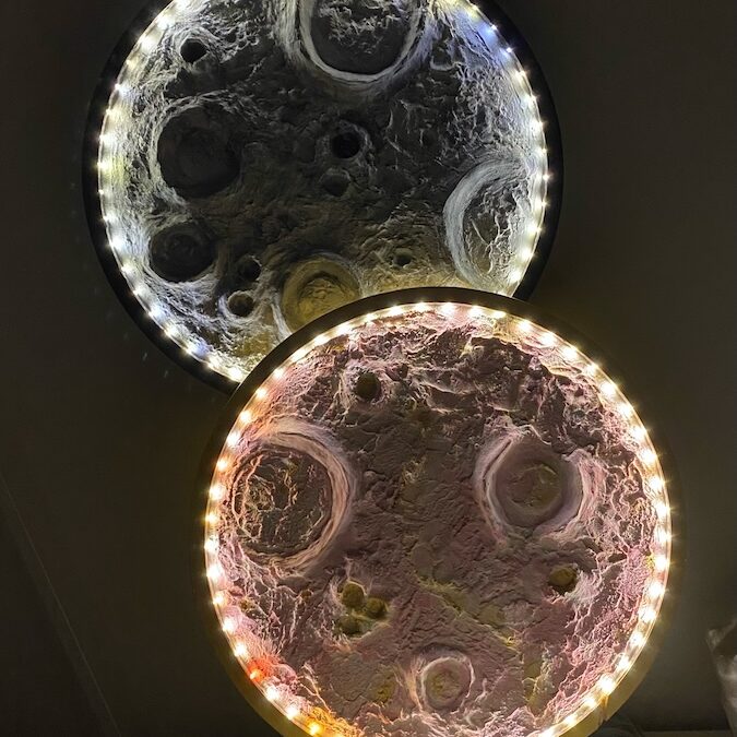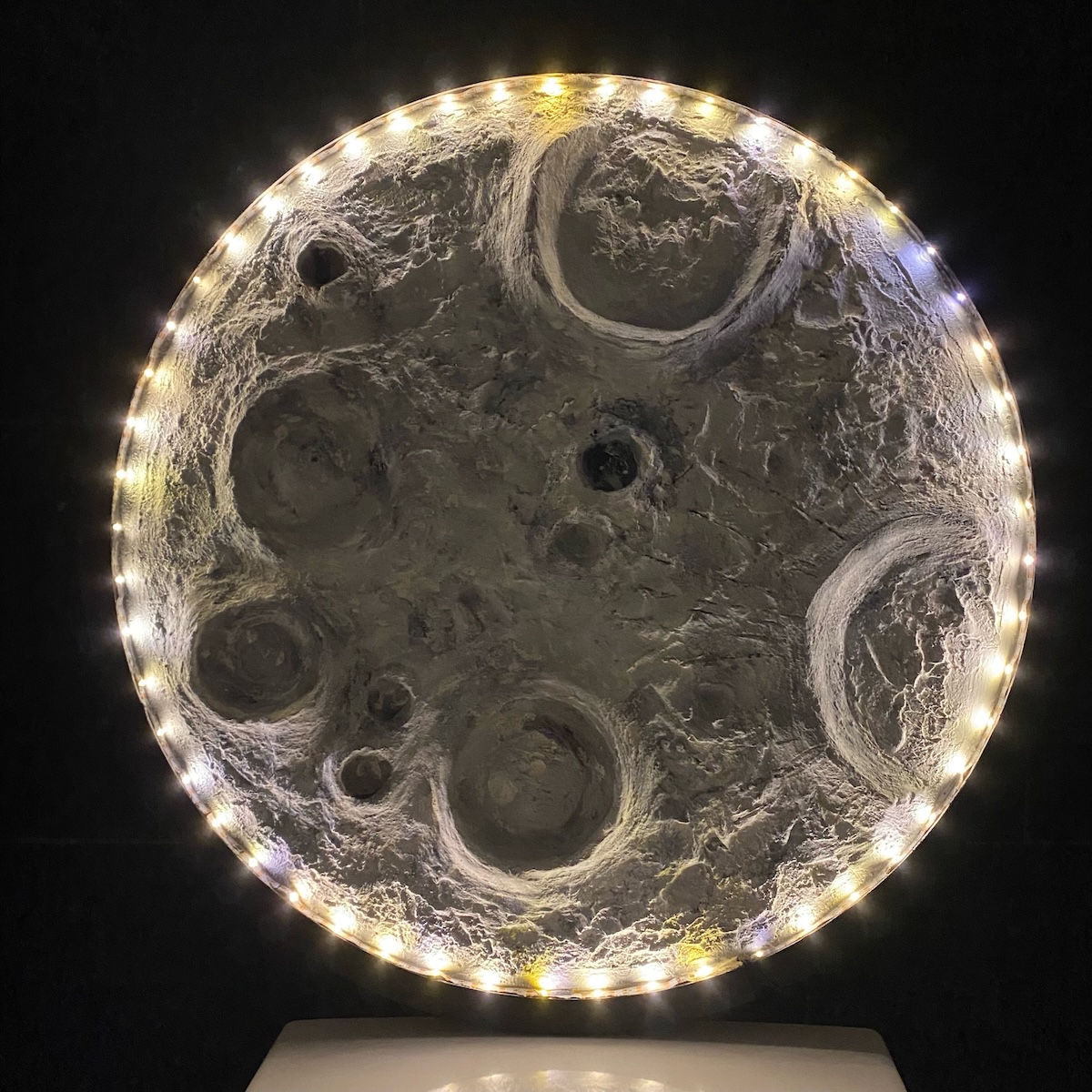 De maan: Deze is te bestellen in gewenste kleur met verlichting! Diameter 60 cm Levertijd: 4 weken Circa €250 per stuk