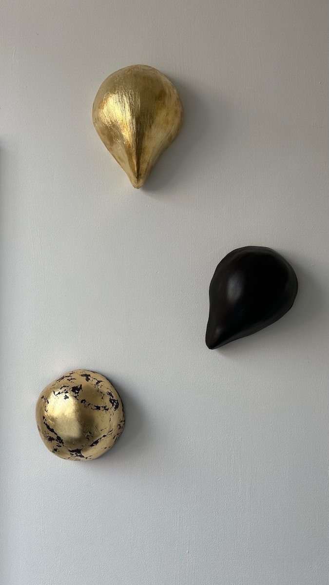 De druppels: Muursculpturen ter decoratie voor bijvoorbeeld een entree. Deze druppels hebben een diameter van ongeveer 17 a 20 cm en zijn in elke gewenste kleur te bestellen. Levertijd: 4 – 6 weken Circa € 150 per stuk