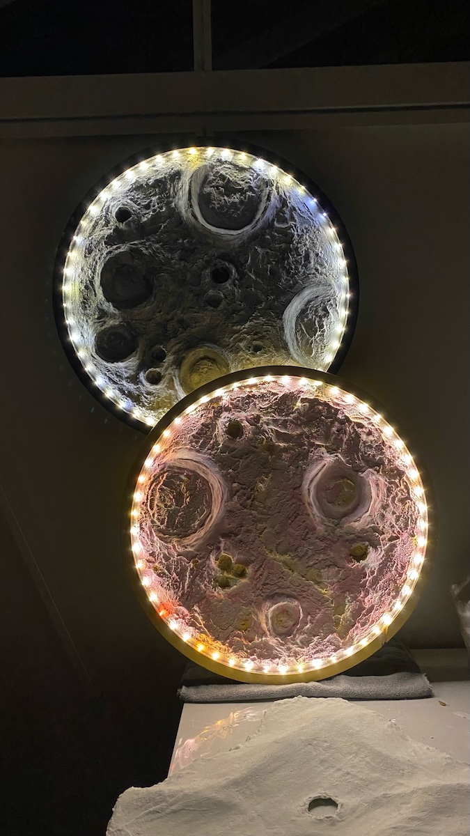 De maan: Deze is te bestellen in gewenste kleur met verlichting! Diameter 60 cm Levertijd: 4 weken Circa €250 per stuk