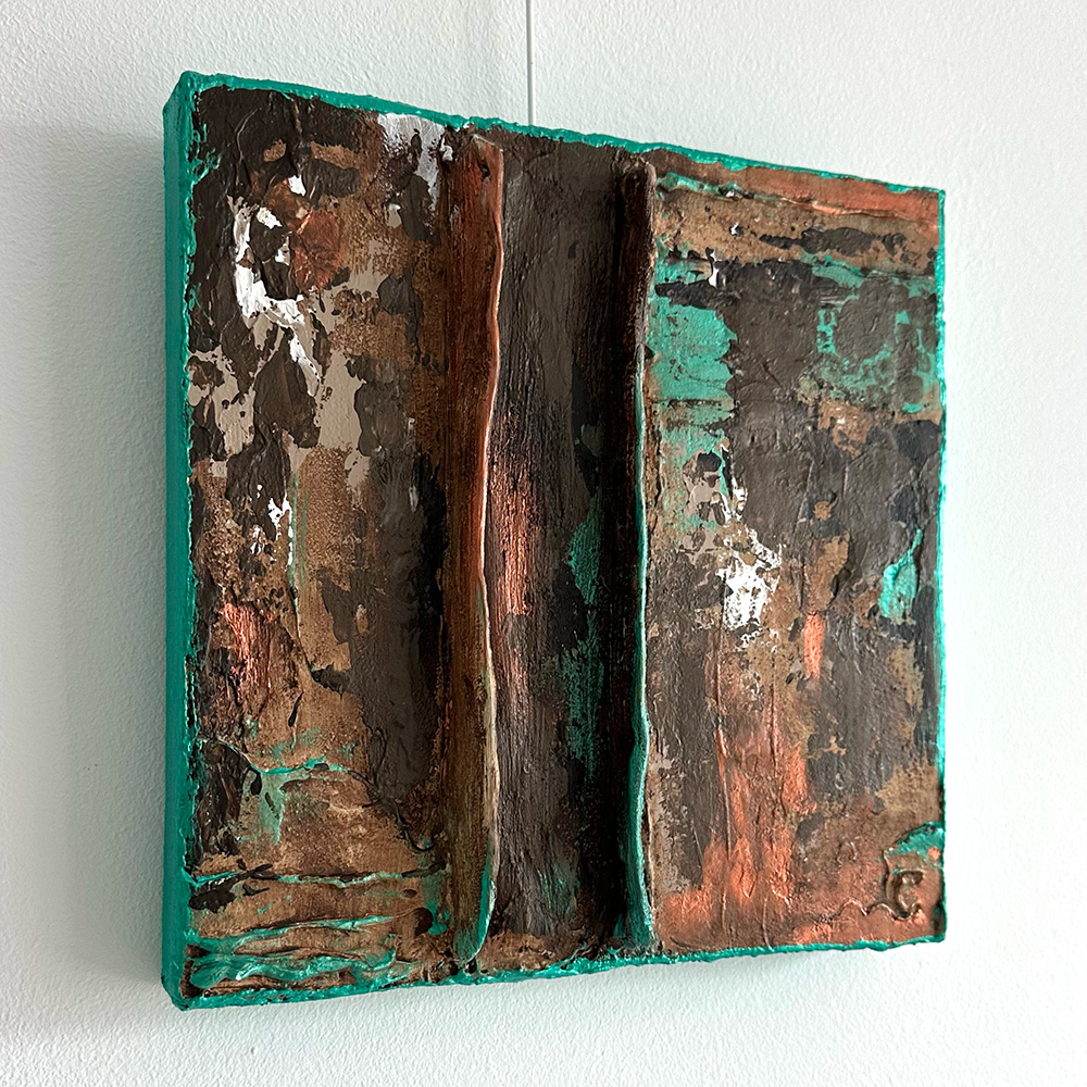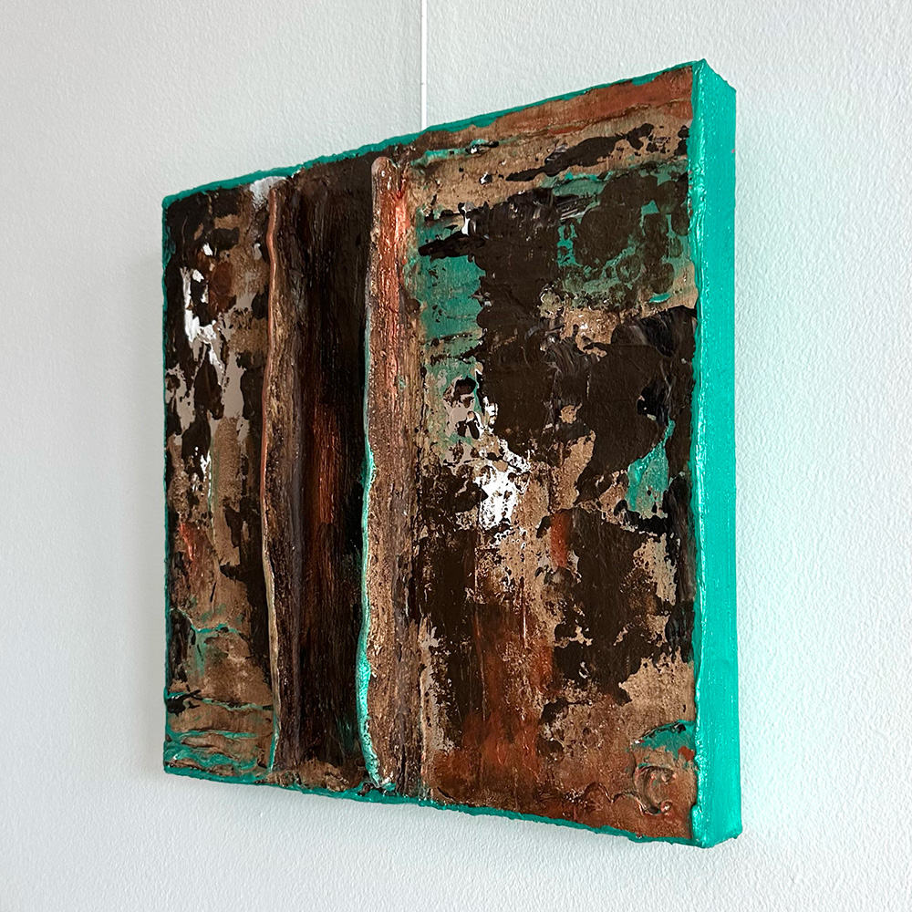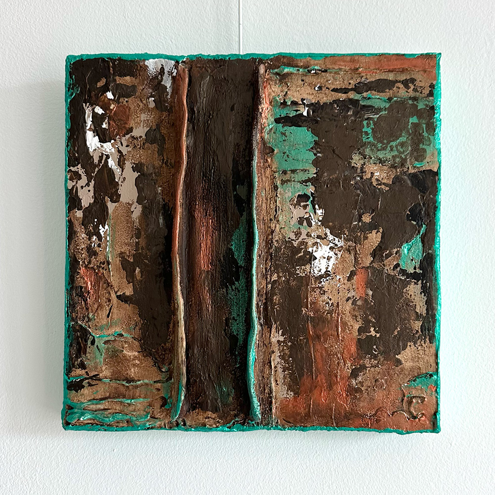 Abstract mixed media in verschillende bruintinten met groen.