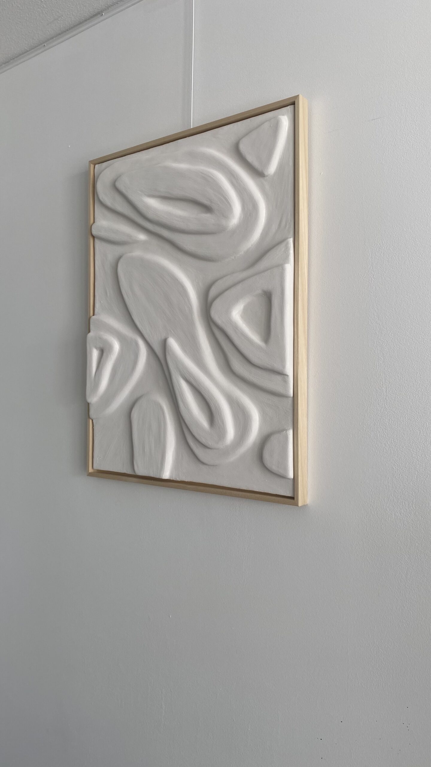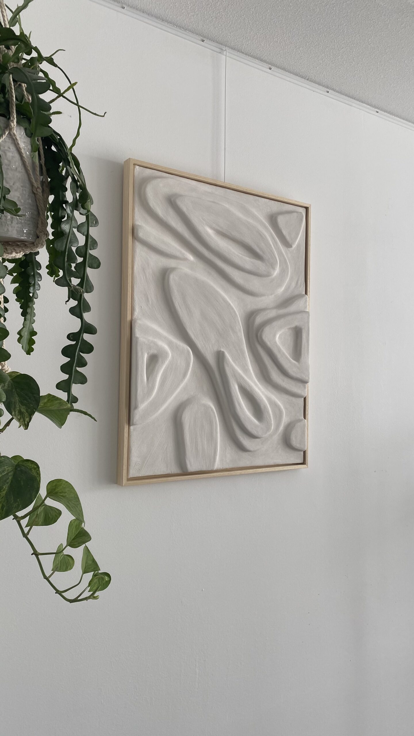 Muursculptuur in lichte kleur verwerkt met zand in houten frame.